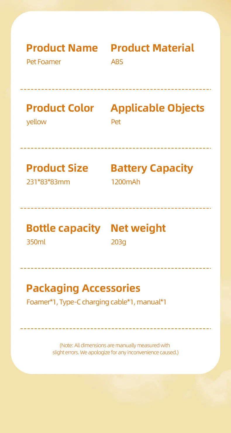 The Electric Pet Shampoo Dispenser is a practical and efficient grooming tool designed to simplify dog baths. Featuring an IPX7 waterproof rating, it ensures safe and hygienic use even in wet conditions. Its dual-chamber design allows simultaneous filling with shower gel and water, streamlining the washing process and reducing product waste. The dispenser produces continuous foam at the press of a button, making application effortless. Powered by a 1200mAh rechargeable battery, it offers up to 3 hours of use after a 4-hour charge and can remain on standby for 1 to 2 months. Its compact ABS body is splash-resistant and space-saving, ideal for any pet care setup.