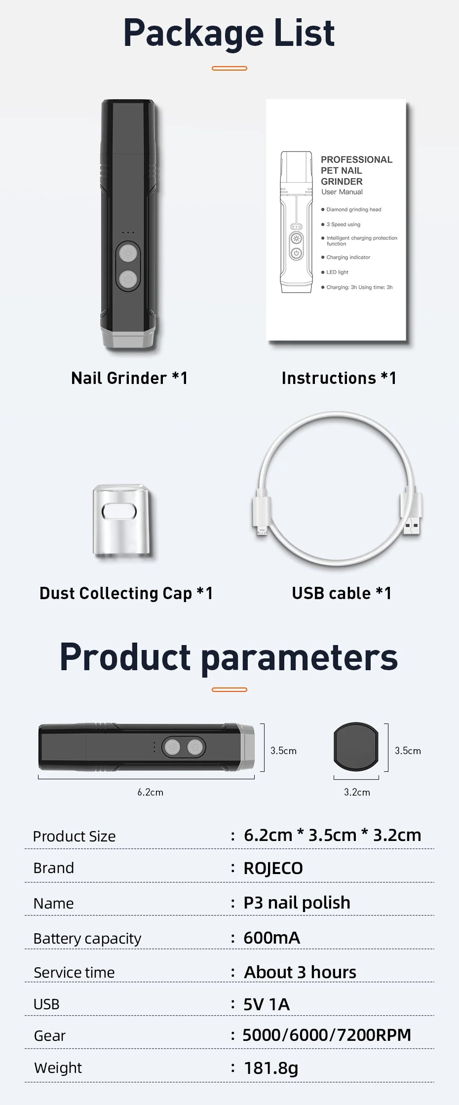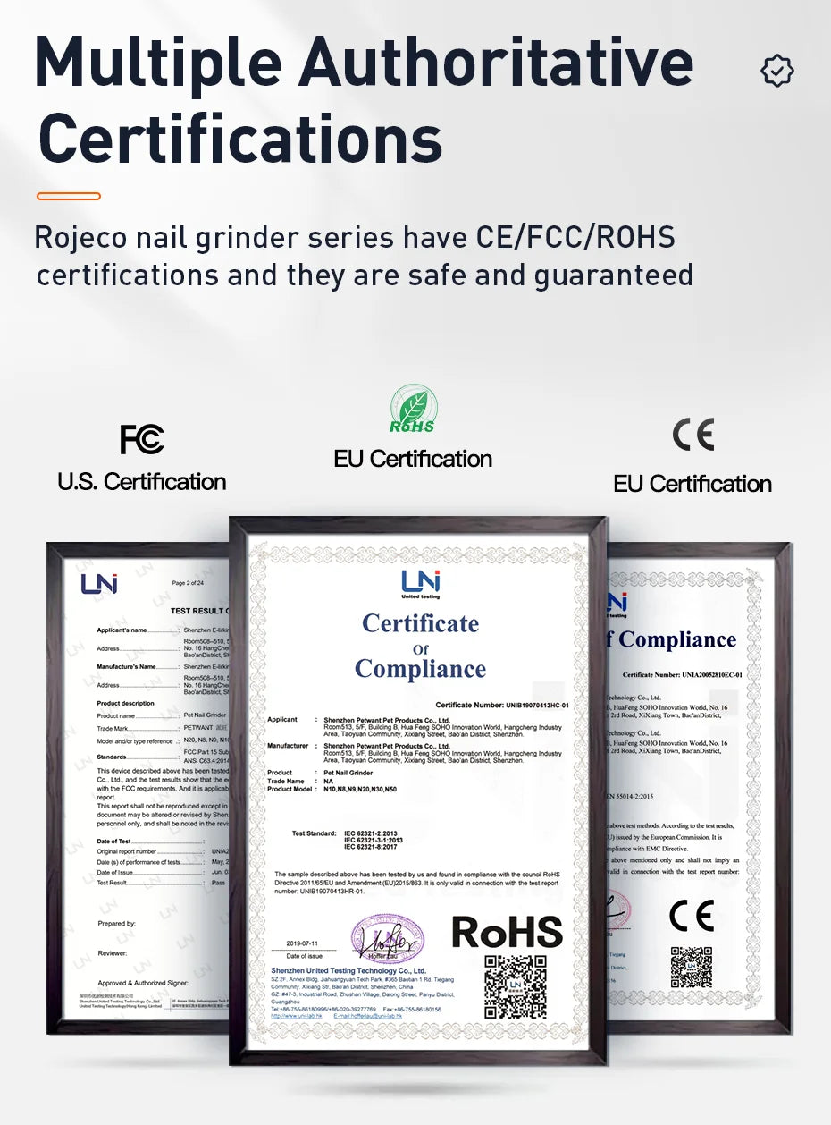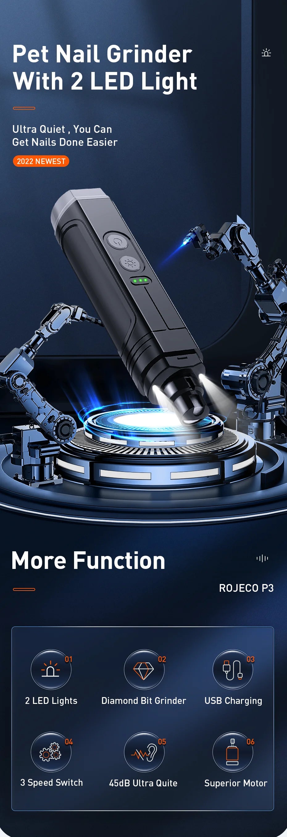 The ROJECO P3 Pet Nail Grinder is a professional-grade grooming tool designed for both dogs and cats. Crafted with durable stainless steel components, it ensures precise and safe nail trimming without harsh chemicals. Featuring two built-in LED lights, it provides clear visibility for accurate grooming even in low-light conditions. This rechargeable electric grinder offers convenience and efficiency, making nail care stress-free for pets and owners alike. Its ergonomic design supports comfortable handling, promoting gentle and effective nail maintenance to keep your pet’s claws healthy and well-shaped.